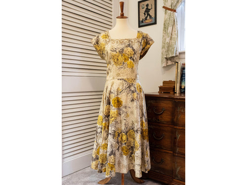 Vintage 1950s Yellow Floral Party Dress Beaded